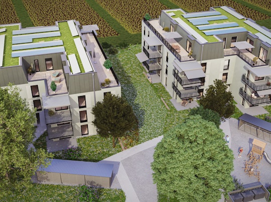 - Begrünte Begegnungszonen und Kinderspielplatz