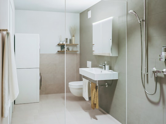 — Beige Feinsteinzeugplatten in den Nasszellen