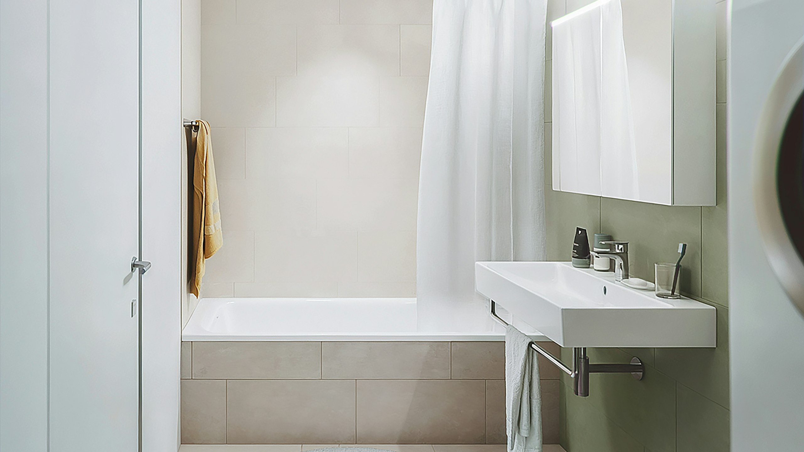 — Wände: Kombination aus beigen und salbeifarbenen Feinsteinzeug-Platten