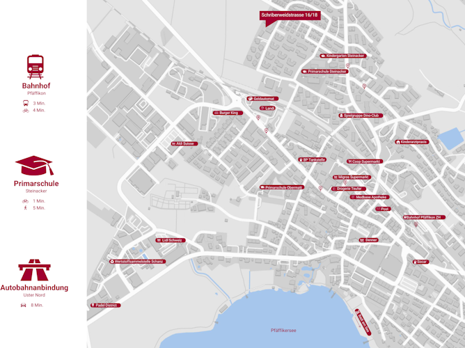 Der idyllische Pfäffikersee, umgeben von malerischen Spazier- und Velowegen, lädt zu Aktivitäten in der Natur ein. Weitere Freizeitangebote wie Sportanlagen und Naherholungsgebiete befinden sich in unmittelbarer Nähe und bieten Abwechslung für Jung und Alt.